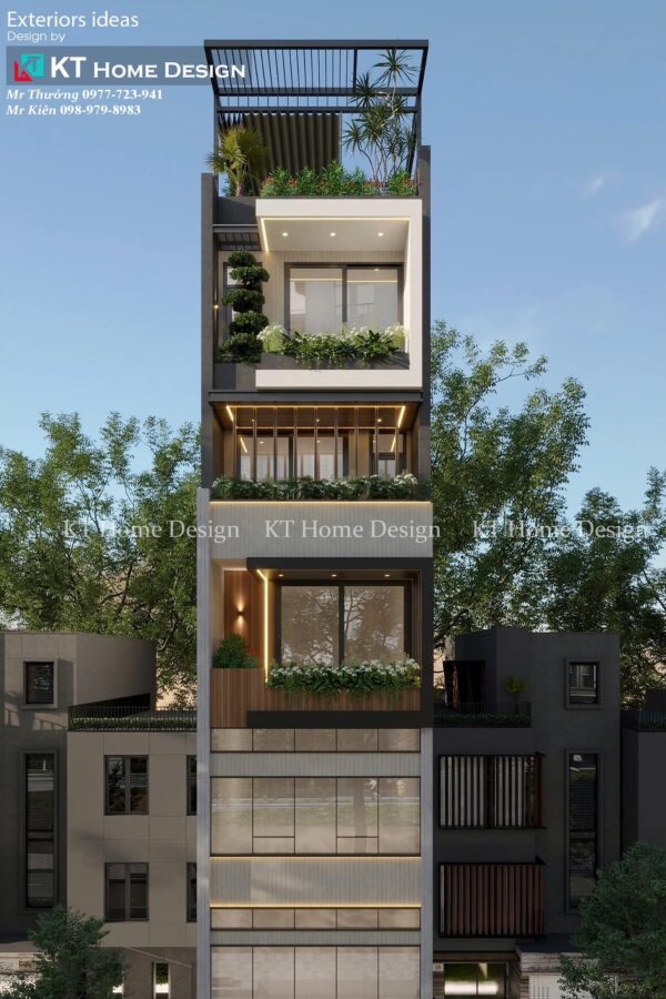 Điểm nhấn nổi bật của mẫu nhà này chính là hệ thống ban công rộng rãi, phủ đầy cây xanh, giúp cân bằng không khí, mang thiên nhiên vào từng góc nhỏ.